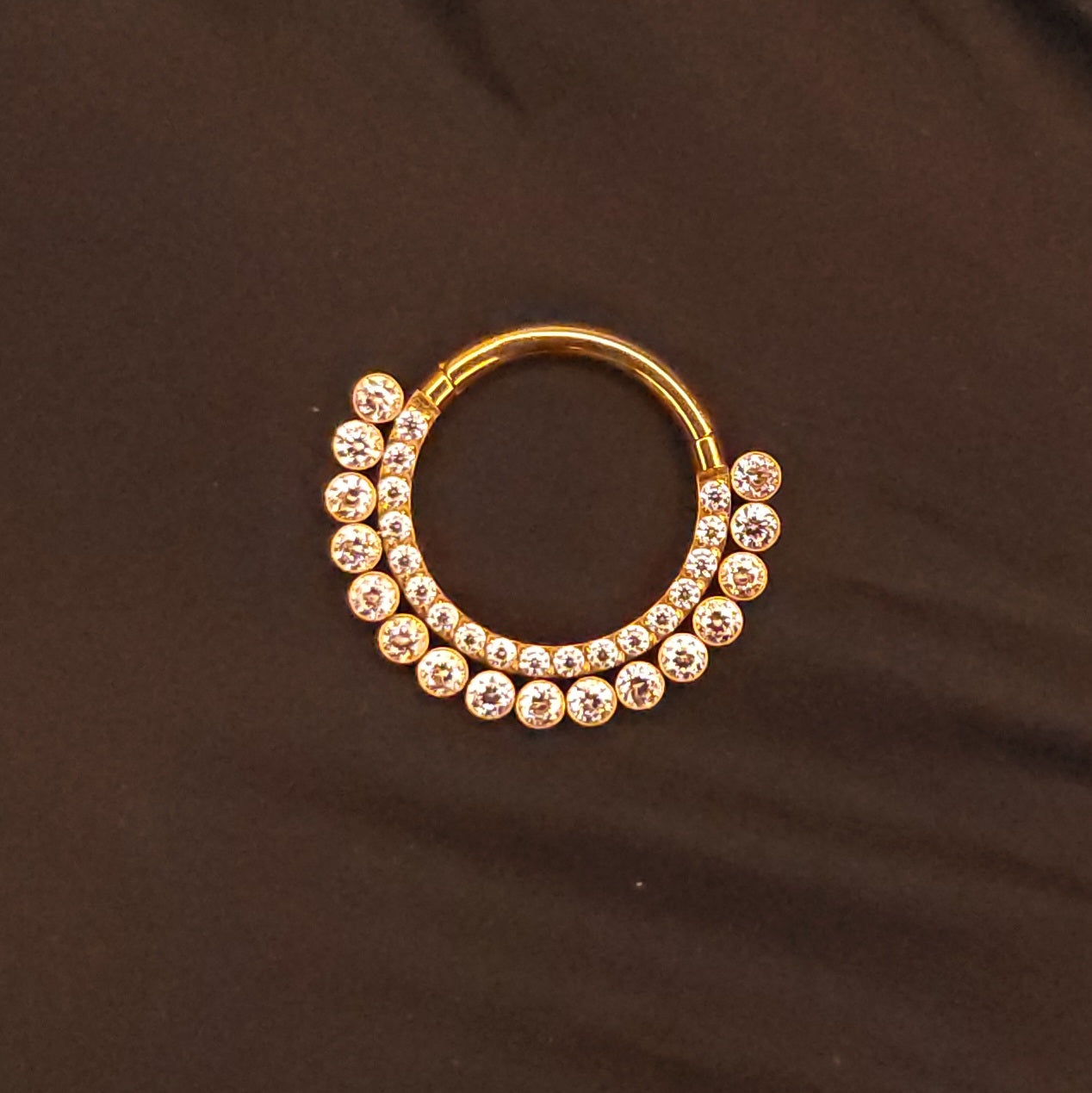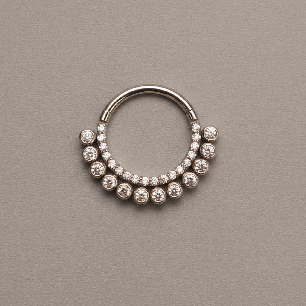 - Gemstone: CZ Gem, 24K PVD/ Implanted Grade Titanium